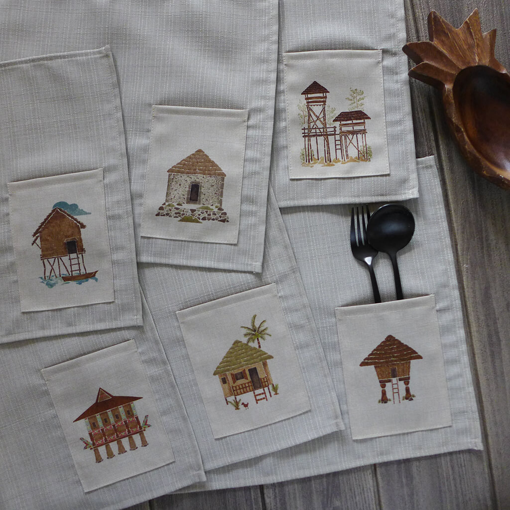 Another addition to our Filipiniana home collection. The assorted placemats set feature illustrations of different traditional houses such as the bahay kubo. Also in the collection are the indigenous houses of Ivatan, Ifugao, Maranao, Higaonon and Badjao.
