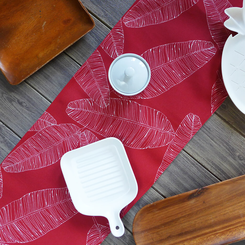Table runner with tropical vibes but in red to elevate your dining space.