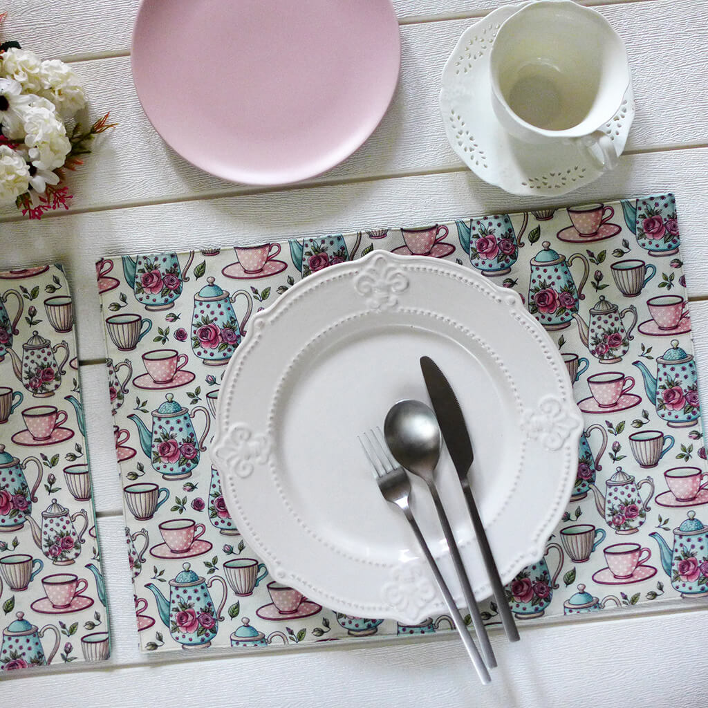 Printed fabric placemats with timeless classic vintage tea set floral design.